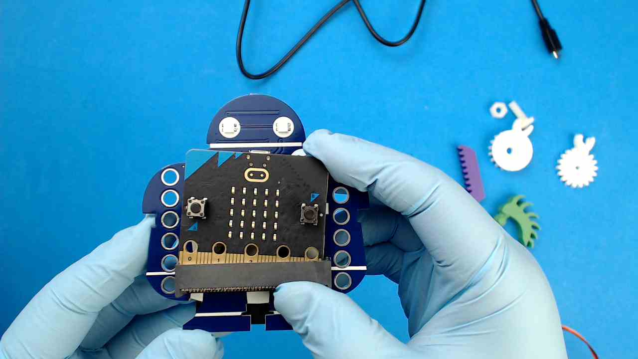 Using your thumbs to support the edge connector box, slide in the micro:bit until firmly in place.